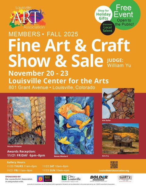 The Louisville Art Association is a Colorado non-profit that exists to help fulfill the ​universal human need to create and enjoy visual art. We provide the opportunity and encouragement for all people in our community to come together to improve their artistic skills, share their creations with others, and more fully appreciate the wonders of our visual world.