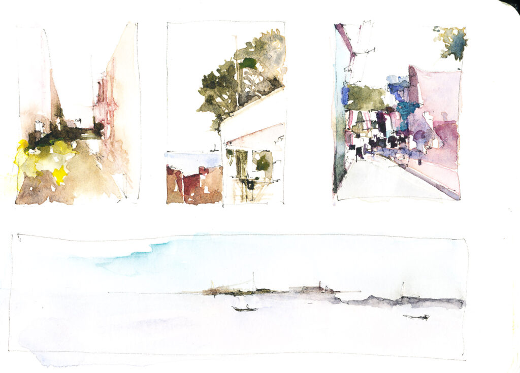 I use travel brushes for urban sketching but full-sized brushes are also good if you can carry them. I suggest using a good quality synthetic watercolor brush in a size 4 or larger if you can only have one. Or just use a waterbrush – I used this as my only brush for over a decade.