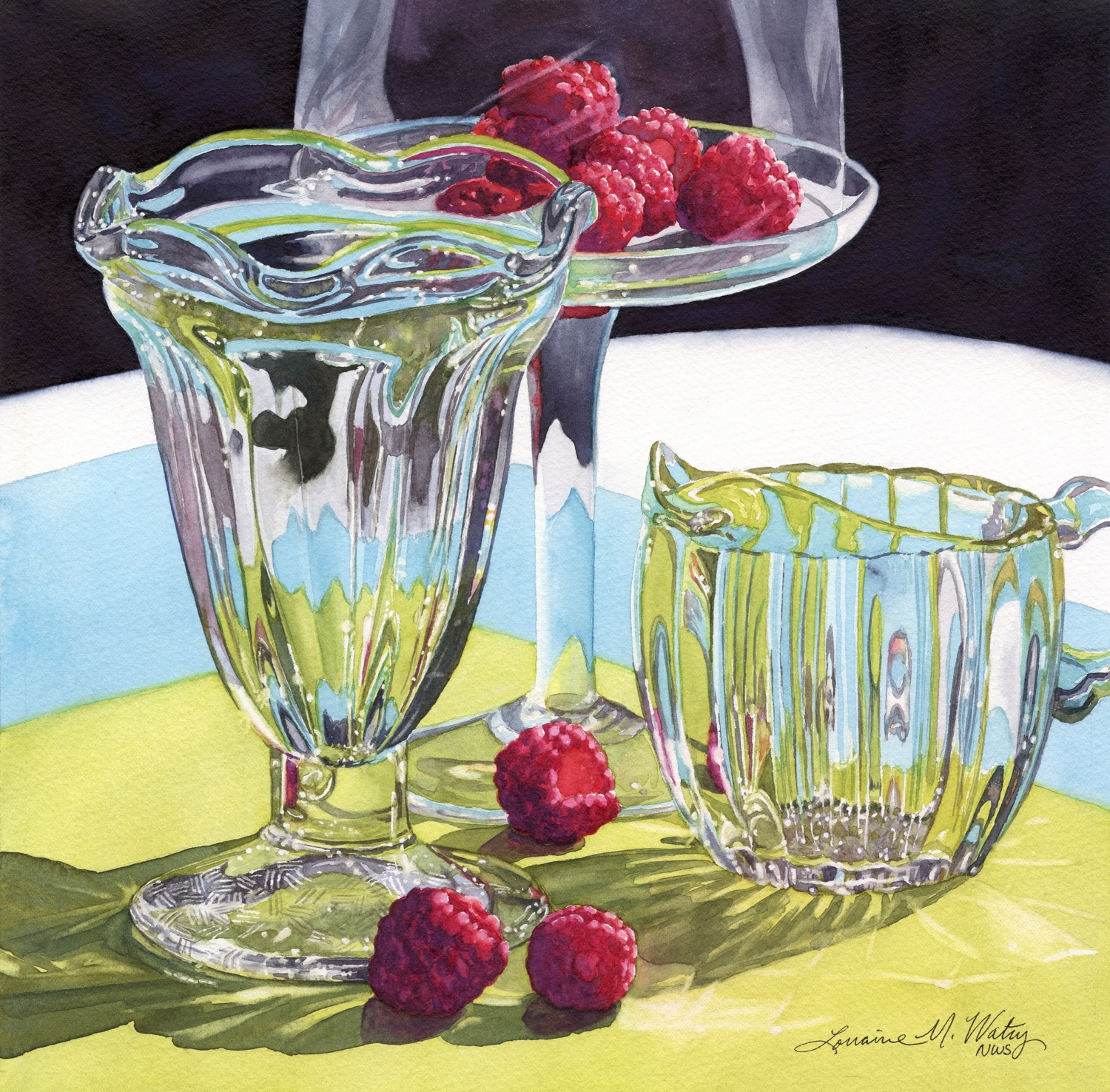 This workshop will teach essential skills and techniques to create the look of realistic glass and metal in watercolor. Learn how to paint the translucent and reflective surfaces by preserving highlights, observing color changes, and including strong darks. Lorraine will also discuss and demonstrate color theory while walking through the steps of the painting.